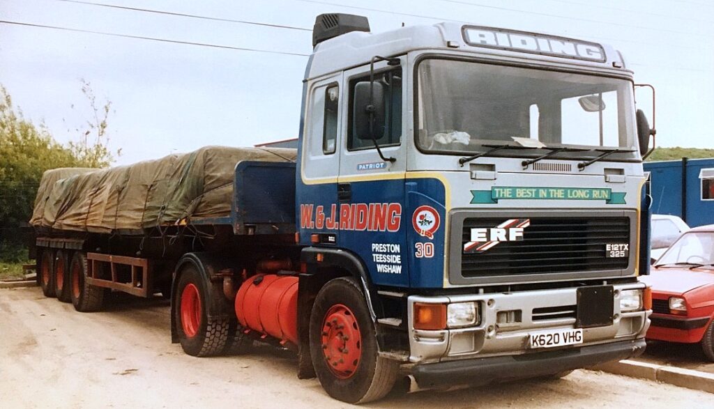 One of a batch of ERF E10 tractor units bought at the time with Cummins L10 325 engines it is pictured here at Riding’s Thornaby depot in 1989 and was driven from new by Joe Gannon.