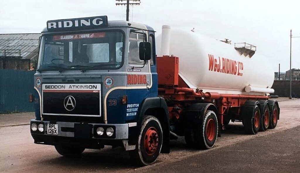 Seddon Atkinson 401 Series 4×2 tractor unit Reg No VPM 233Y Fleet No 15 ‘Black Douglas’ (Chassis No 74165) was originally registered new on the 1st of August 1982 to London Carriers and bought second hand in April 1987 by Riding’s when five years old from local dealer Syd Hartley & Sons at a cost of £4,500 plus vat
